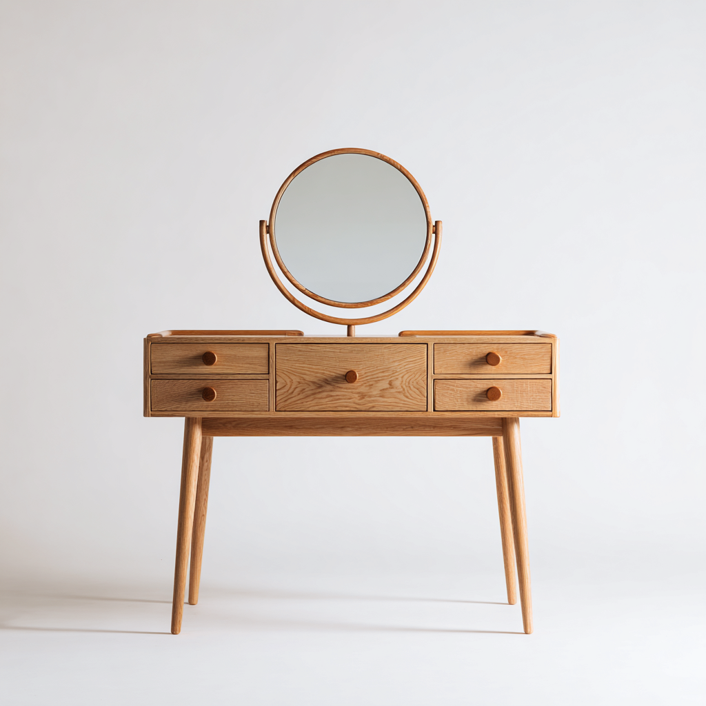 Toeletta con specchio rotondo da camera 110x45x135 cm - Legno naturale - Design retrò minimal
