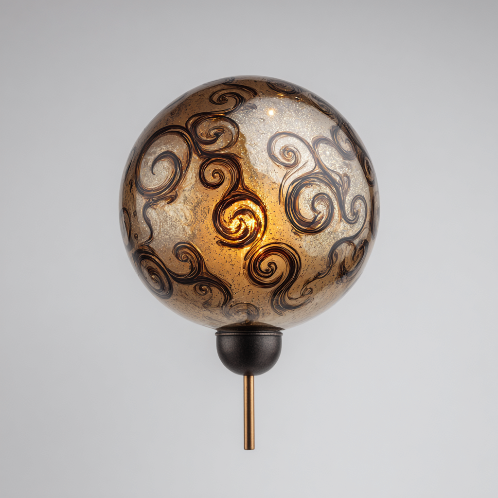 Il corpo lampada è realizzato in metallo con finitura nera, abbinato a un paralume sferico in vetro color ambra con motivi decorativi a spirale. La lavorazione accurata del vetro valorizza la diffusione luminosa e l'aspetto ornamentale.
