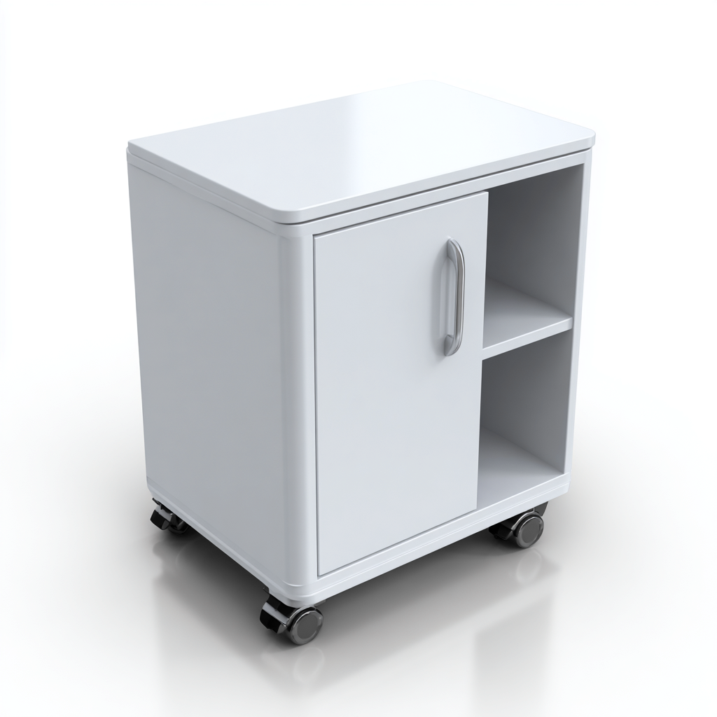 L'armadio combina un vano chiuso con un'anta e ripiani aperti laterali, offrendo una soluzione flessibile per l'archiviazione di documenti, accessori e materiali da ufficio. La base con ruote facilita lo spostamento all'interno dell'ambiente di lavoro.