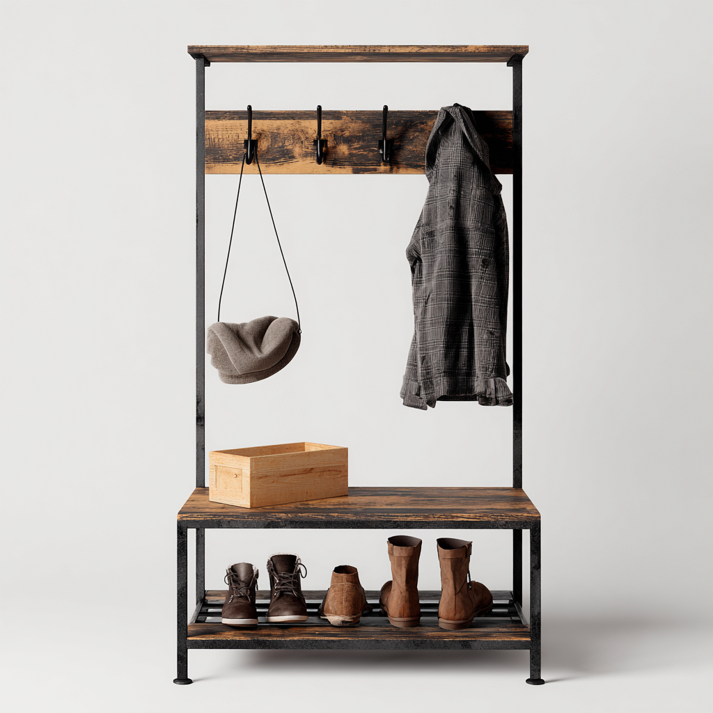 Questo attaccapanni da ingresso in stile industriale è progettato per offrire una soluzione pratica e ordinata per l'organizzazione quotidiana. La struttura autoportante combina appendiabiti, piano d'appoggio e ripiani inferiori, risultando ideale per ingressi, corridoi o zone guardaroba.