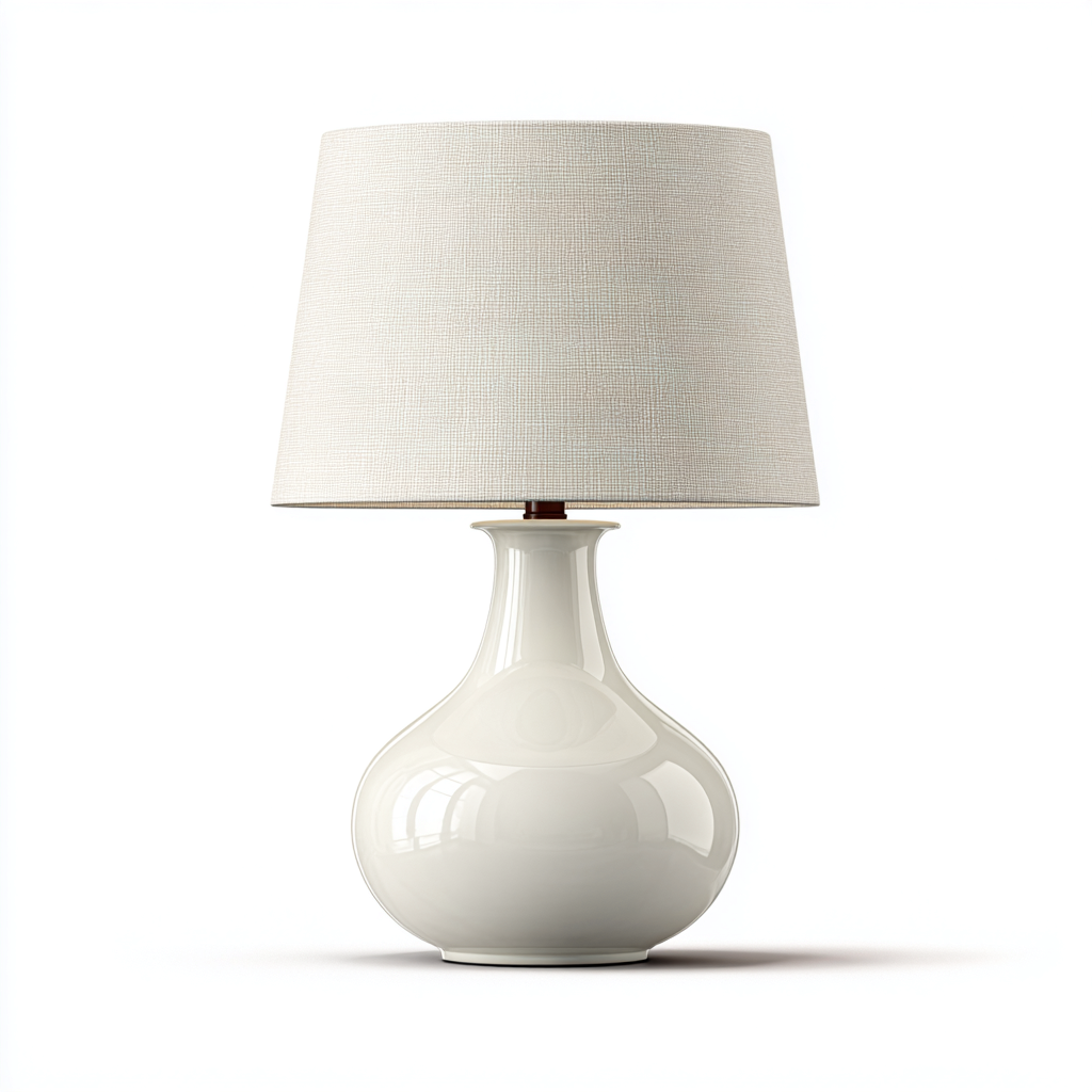 La base è realizzata in ceramica con finitura liscia di colore bianco. Il paralume in tessuto chiaro diffonde la luce in modo uniforme, garantendo un aspetto raffinato e una buona durata nel tempo.