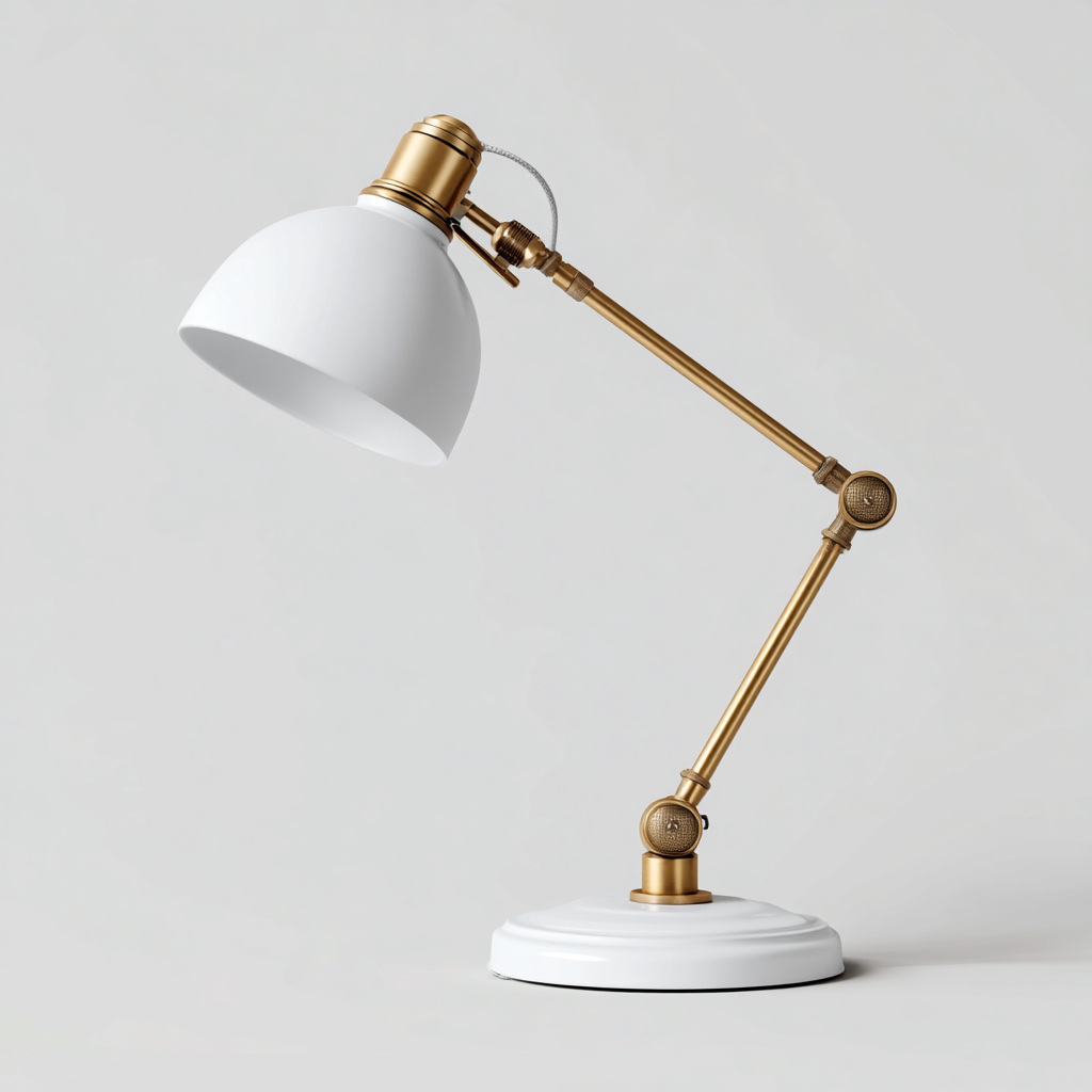 La struttura è realizzata in metallo con finitura color ottone, abbinata a un paralume metallico bianco. La base solida garantisce stabilità durante l'utilizzo, mentre le giunzioni sono rifinite con cura per un movimento fluido.