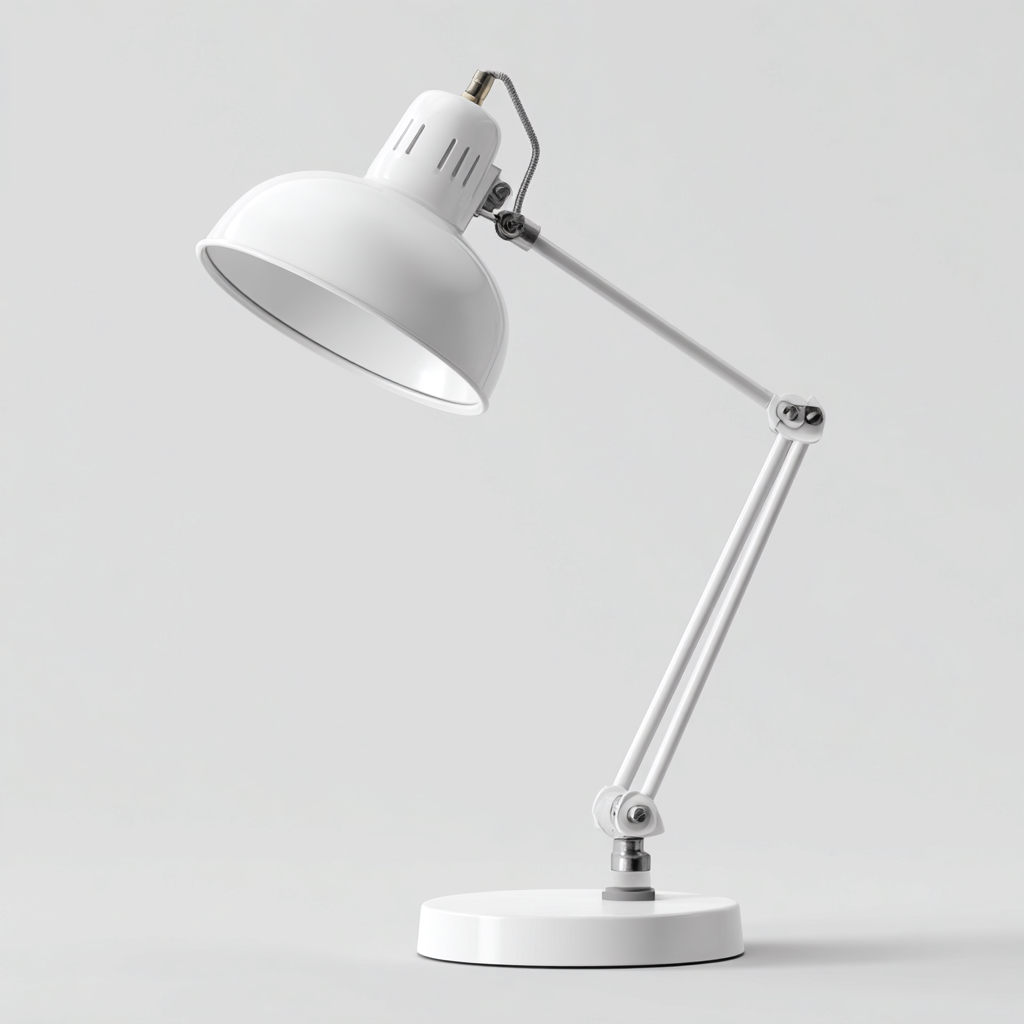La struttura è realizzata in metallo verniciato bianco con finitura liscia e uniforme. Il paralume metallico assicura una schermatura efficace della luce, mentre i bracci articolati garantiscono solidità e precisione nei movimenti.