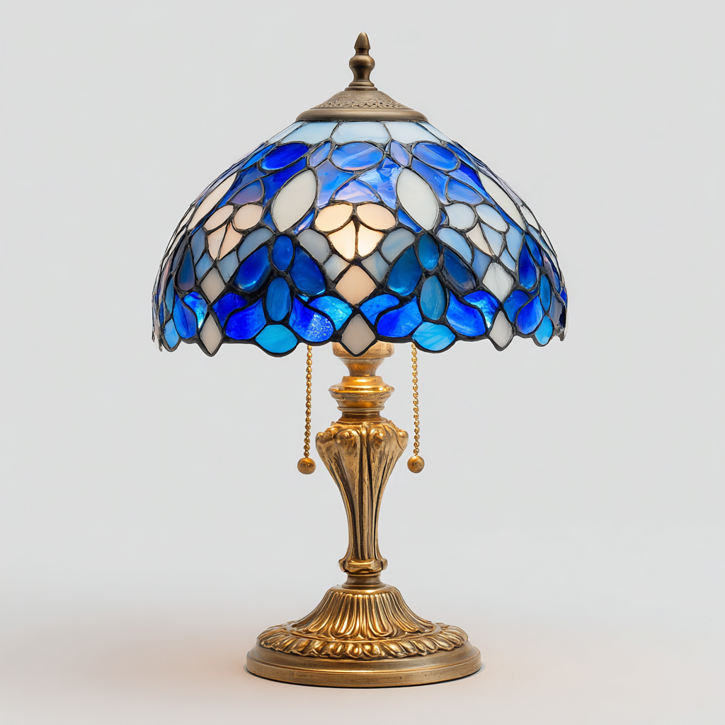 Il paralume è realizzato in vetro colorato assemblato con tecnica decorativa, nei toni del blu e del bianco. La base è in metallo con finitura color ottone, caratterizzata da dettagli lavorati che conferiscono stabilità e un aspetto classico.