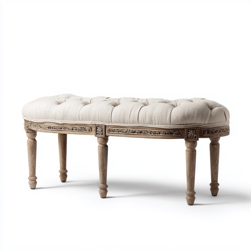 Seduta rivestita in tessuto di colore beige con imbottitura morbida e lavorazione a trapuntatura. La struttura è rifinita con dettagli decorativi intagliati che valorizzano lo stile tradizionale del prodotto.
