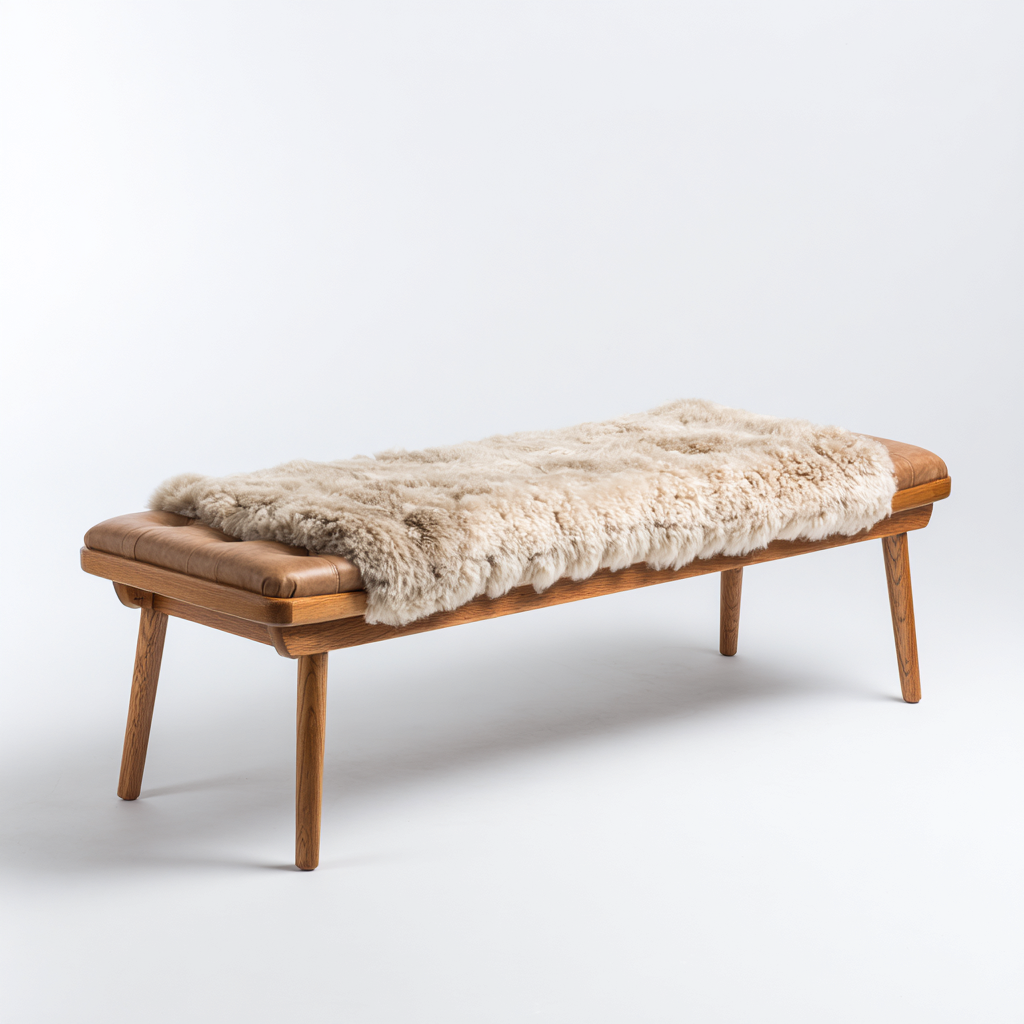 La struttura è realizzata in legno naturale con finitura a vista, mentre la seduta è rivestita in tessuto effetto pelliccia nei toni beige chiaro. La lavorazione accurata garantisce stabilità e una piacevole resa estetica.