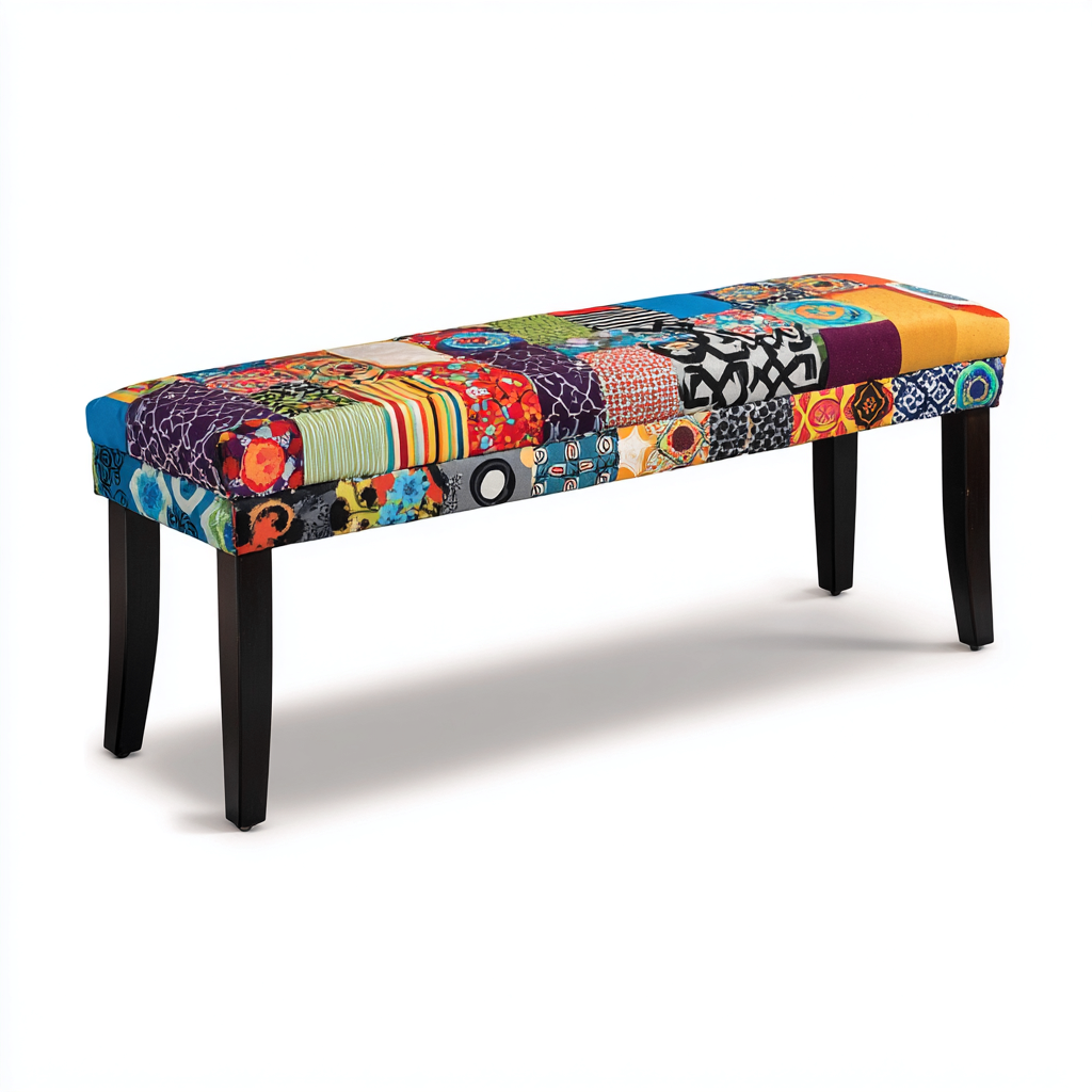 Questa panca per letto è progettata per l'utilizzo in camera da letto e aggiunge un accento decorativo allo spazio ai piedi del letto. La seduta imbottita con rivestimento a patchwork offre una soluzione pratica per sedersi o appoggiare indumenti e accessori.