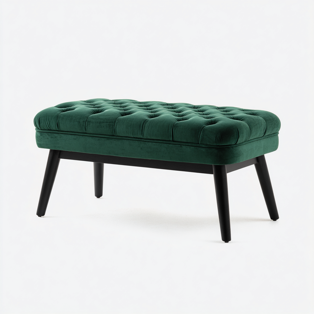 La seduta è rivestita in velluto verde scuro con lavorazione trapuntata, mentre la struttura è sostenuta da gambe in legno con finitura nera. I materiali sono selezionati per garantire stabilità, resistenza e un aspetto curato nell'uso quotidiano.