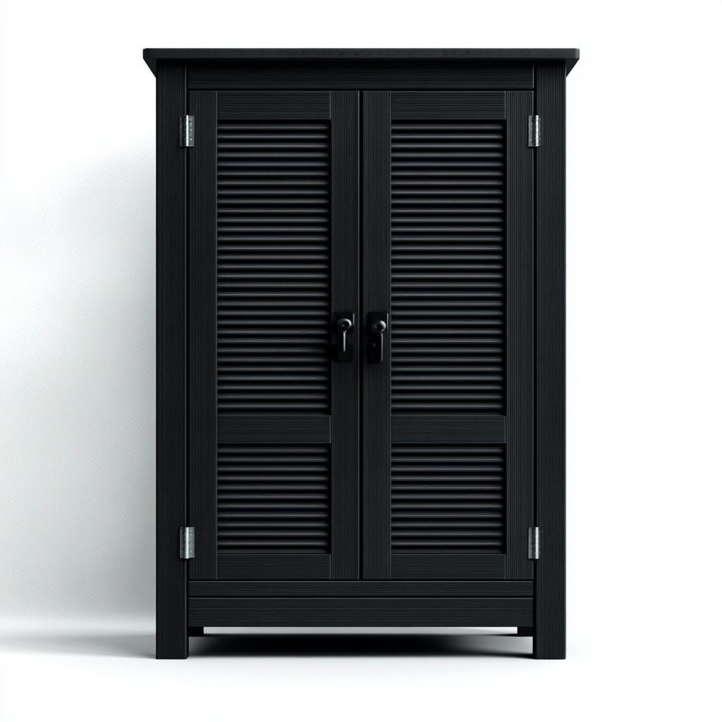 La struttura è realizzata in legno con finitura di colore nero. Le ante frontali sono dotate di pannelli a listelli che favoriscono la ventilazione interna, mentre le cerniere in metallo garantiscono un'apertura stabile e fluida.