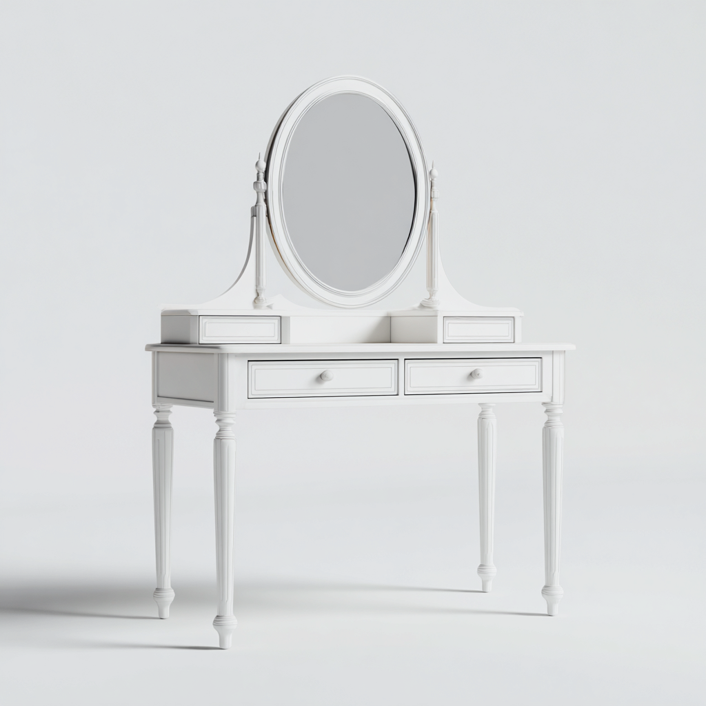 Elegante toeletta con specchio ovale ideale per la camera da letto o l'area beauty. Il design classico e raffinato crea uno spazio funzionale e ordinato dedicato alla cura personale quotidiana.