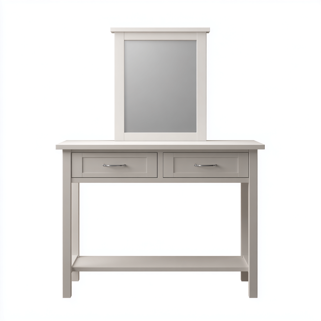 Toeletta da camera con linee pulite e specchio rettangolare integrato, ideale per l'organizzazione quotidiana di cosmetici e accessori personali.